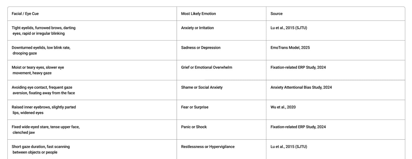 Third but not least, after establishing a solid foundation, we explored how the AI would process information to predict emotional states. Through both research and testing with random participants and patients, we created a table illustrating how different facial and eye movements correlate with specific emotions, based on studies of human expression and behavior. These visual cues, when combined with internal data such as EEG, enhance the AI’s ability to accurately recognize what someone may be feeling.