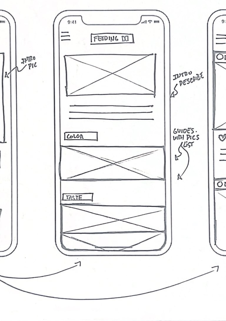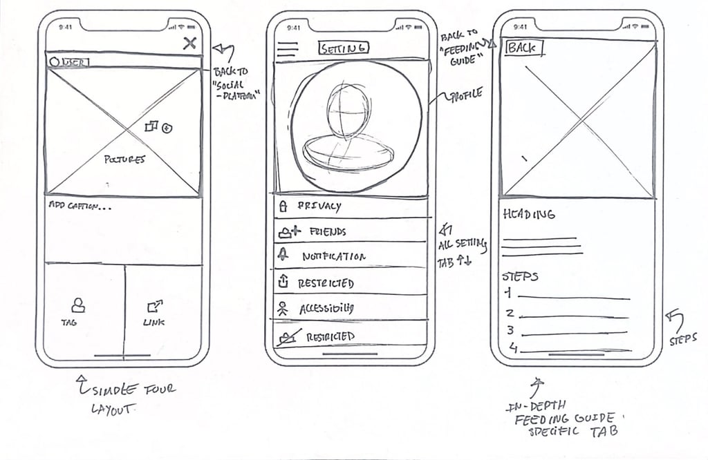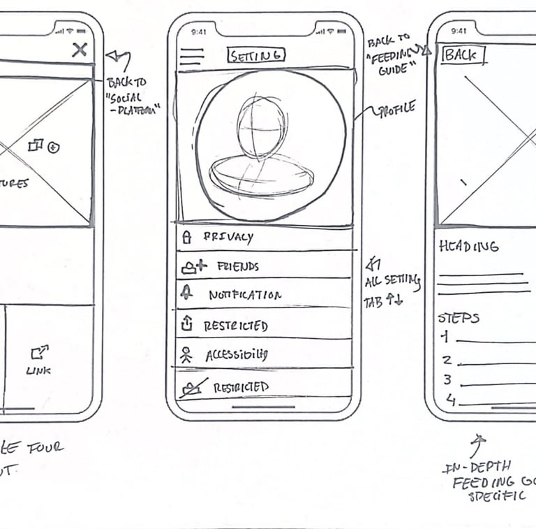 To start the process, I created sketches of the primary screens to outline functionality and hierarchy.