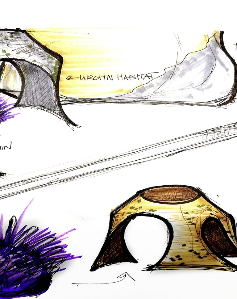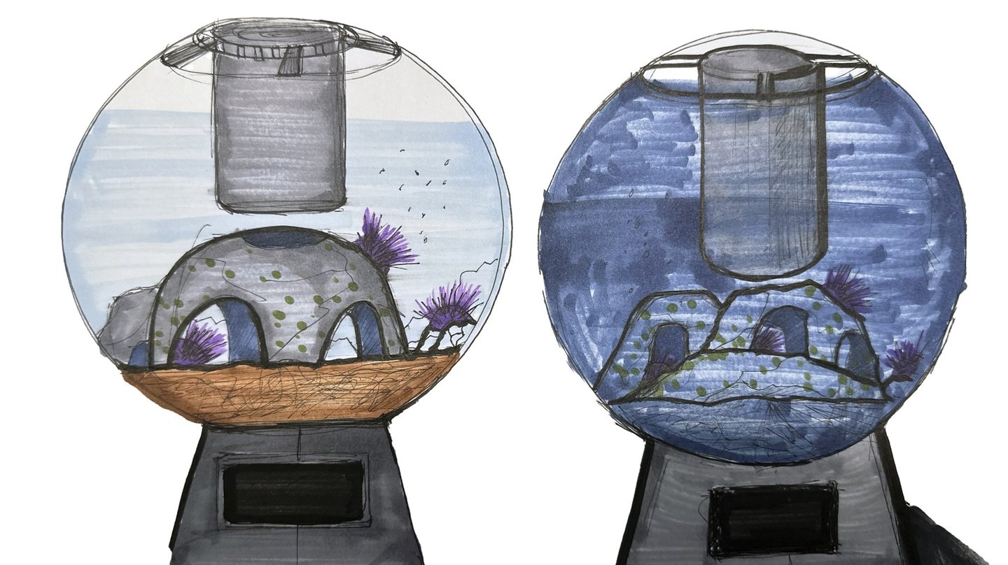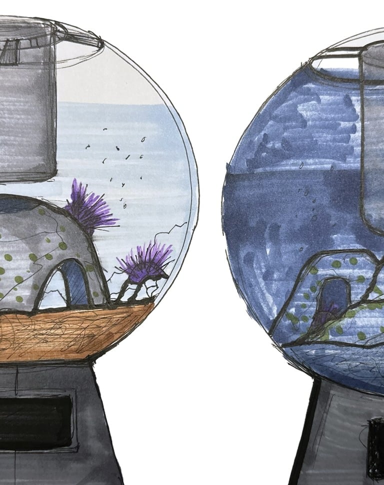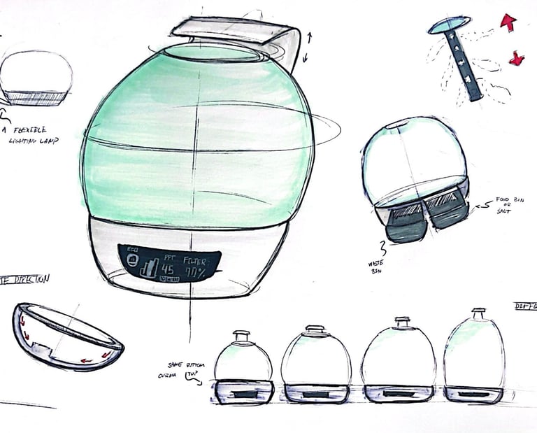 In the brainstorming phase, I sketched out a range of possible solutions to address the main issue. Over time, I refined these ideas into a more focused design, which ultimately led to the UrchinCove tank. This process is documented through my sketches.