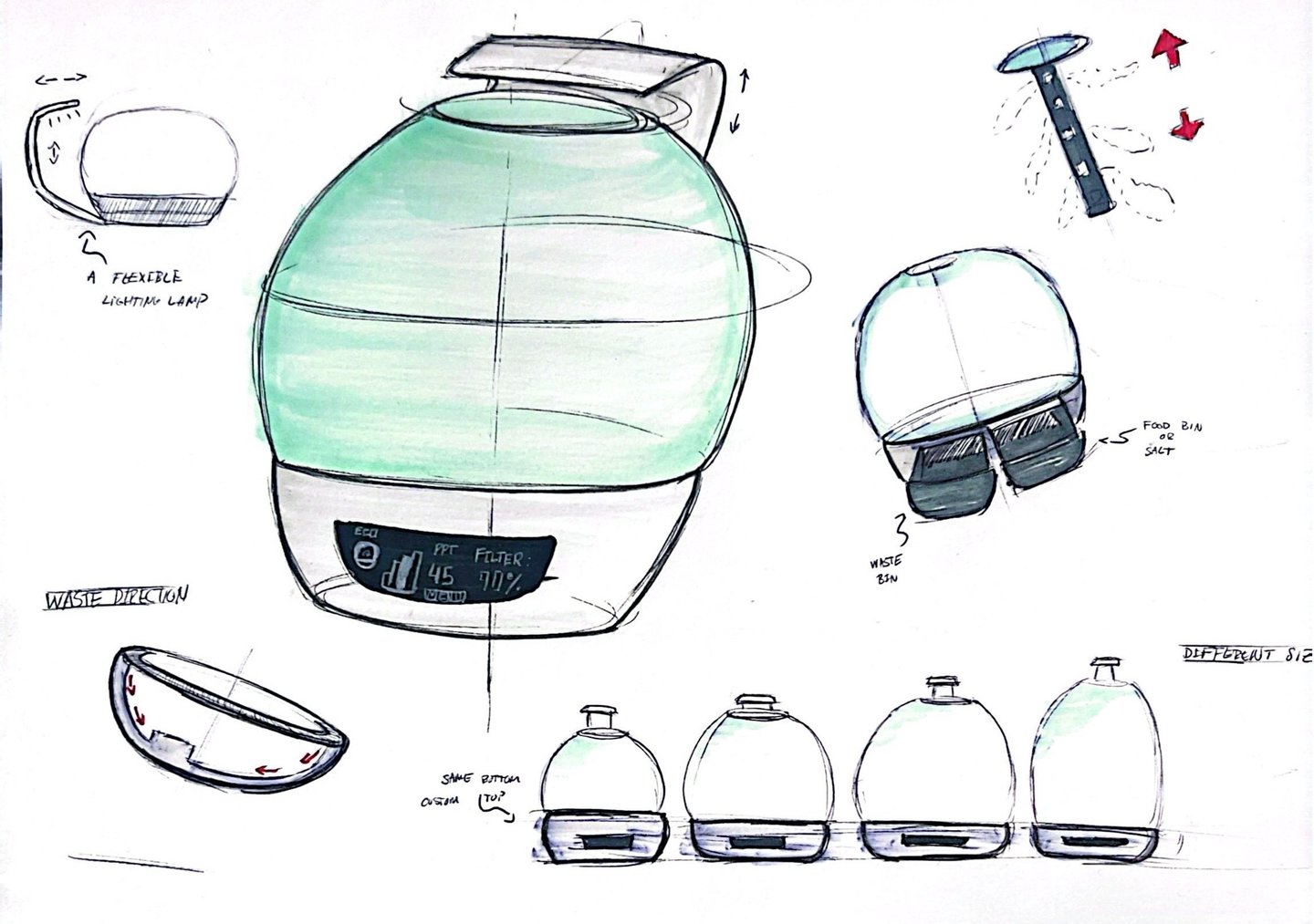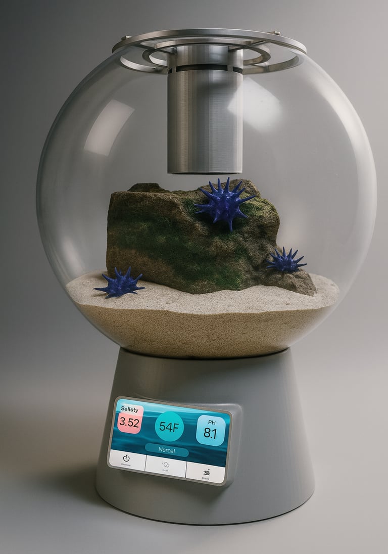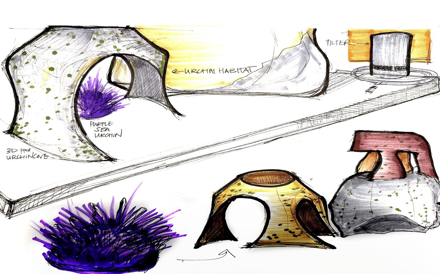 In the brainstorming phase, I sketched out a range of possible solutions to address the main issue. Over time, I refined these ideas into a more focused design, which ultimately led to the UrchinCove tank. This process is documented through my sketches.