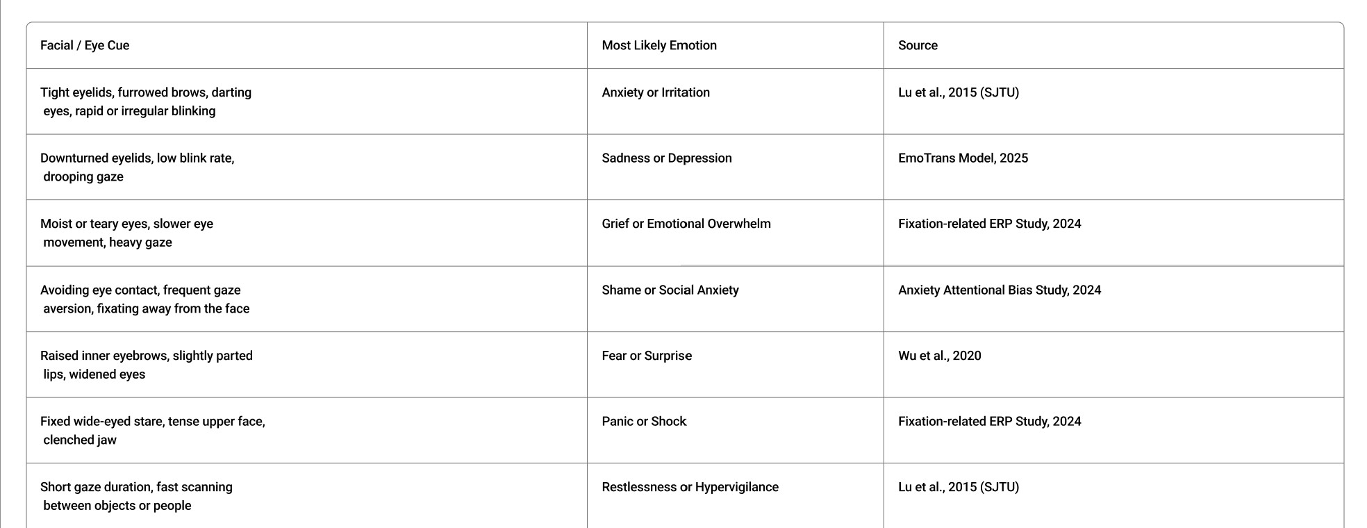 “Facial cues can add important emotional context, but people can still mask expressions. Among facial features, the eyes are often the most telling, which is why combining them with voice data leads to more accurate affective computing.”