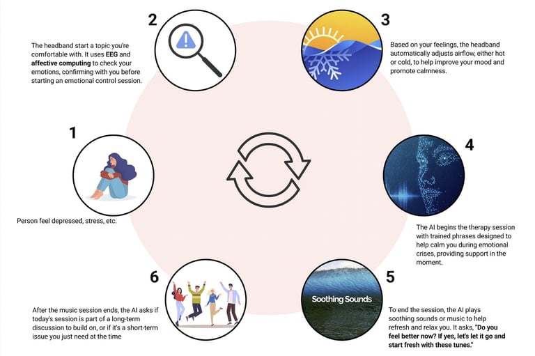 A wearable mental health device that uses EEG sensors and AI to detect emotional states. It provides real-time support through voice interaction, music, and adaptive airflow to help regulate emotions.